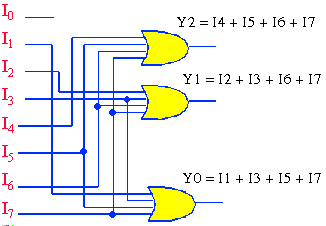 | Mạch mã hoá 8 đường sang 3 đường còn gọi là mã hoá bát phân sang nhị phân (có 8 ngõ vào chuyển thành 3 ngõ ra dạng số nhị phân 3 bit. Trong bất cứ lúc nào cũng chỉ có 1 ngõ vào ở mức tích cực tương ứng với chỉ một tổ hợp mã số 3 ngõ ra; tức là mỗi 1 ngõ vào sẽ cho ra 1 mã số 3 bit khác nhau. Với 8 ngõ vào (I0 đến I7) thì sẽ có 8 tổ hợp ngõ ra nên chỉ cần 3 ngõ ra (Y2, Y1, Y0). |