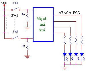 Ví dụ khi nhấn phím SW2 mã sẽ tạo ra là 0010 và led hiển thị số 2. Như vậy mạch đã sử dụng 1 bộ mã hoá 10 đường sang 4 đường hay còn gọi là mạch chuyển đổi mã thập phân sang BCD.