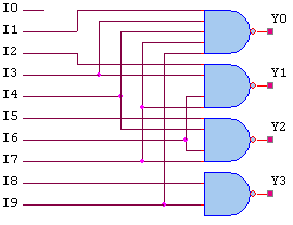 Rõ ràng với 10 ngõ vào, 4 ngõ ra; đây là 1 bài toán thiết kế mạch logic tổ hợp đơn giản sử dụng các cổng nand như hình dưới đây :