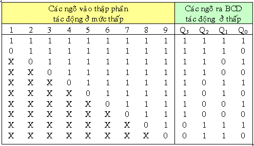 Nhìn vào bảng sự thật ta thấy thứ tự ưu tiên giảm từ ngõ vào 9 xuống ngõ vào 0. Chẳng hạn khi ngõ vào 9 đang là 0 thì bất chấp các ngõ khác (X) số BCD ra vẫn là 1001 (qua cổng đảo nữa). Chỉ khi ngõ vào 9 ở mức 1 (mức không tích cực) thì các ngõ vào khác mới có thể được chấp nhận, cụ thể là ngõ vào 8 sẽ ưu tiên trước nếu nó ở mức thấp.